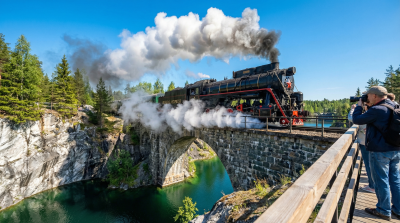 Горный парк «Рускеала»: Мраморный каньон, заполненный изумрудной водой — визитная карточка Карелии. Добраться сюда из Сортавалы можно на уникальном ретропоезде на паровой тяге (не забудьте купить билеты заранее!).
