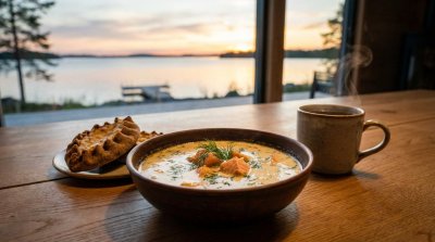 Добро пожаловать в Карелию! Наш первый карельский пункт — посёлок Куркиёки (в переводе — «Журавлиная река»). Археологи считают это место одним из очагов формирования карельского народа. Чуть дальше по трассе нас ждет город Лахденпохья. Именно здесь нужно обязательно сделать паузу, чтобы попробовать традиционную сливочную уху из форели — лохикейто.
