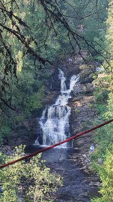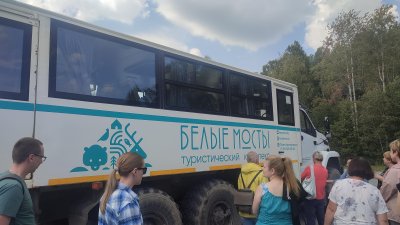 Часа через два мы прибыли на место нашего основной цели экскурсии на то место, где нас с обычного автобуса пересадили во всепроходимый Урал, трёхосный с тремя ведущими мостами, который нас должен был доставить к месту водопадов Белые Мосты. Ехать было порядка 40 минут плюс-минус, доехали мы за полчаса, нас высадили на полянке, дали направление и мы пошли изучать что такое это за водопады белые мосты. Сначала я пошёл к малому водопаду, в общем-то он располагается не на очень большой высоте но однозначно красивый и когда к нему идешь как раз проходишь именно через мост почти белого цвета, благодаря которому и было дано название водопадом. Возвращаясь обратно я заметил что здесь есть действующий троллей и можно прямо по нему переехать через пространство большого водопада и потом вернуться назад. А я любитель троллеев и с удовольствием съехал с горочки, любуясь большим водопадом. Тут уже наше время подошло к концу и нас тем же успехом загрузили в Урал и довезли до места посадки в автобусе, откуда мы отправились на на месторождения граната...
