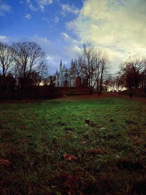 В первой половине XIX века в Петербург пришла мода на неоготику. Типичный ее пример — церковь в Шуваловском парке.