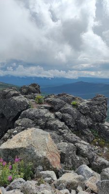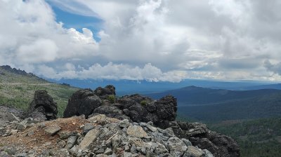 Идти до него по верховому болоту до курумника - это стоит учитывать при выборе обуви. Мы шли по меткам, которые остались с прошедшего ранее марафона. Да, да, здесь регулярно в июле устраивают марафонский забег. Забравшись на первый уровень появилась вершина второго уровня. Путь также покурумнику. А потом и третий уровень, на котором вершина, с которой обзор на много километров во все стороны. На вершине всегда ветер, но есть места где от него можно укрыться и заправиться.