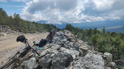 Добравшись до своихвелосипедов устроили небольшой перерыв и в путь, время поджимало - было уже около 20:00, а нам еще спускаться 16 км. Спуск был быстрее чем подъём, значительно быстрее - около 45 минут. Иногда я пользовался тормозами, но это было редко. Итого максимальная скорость 48км/ч. На обратном пути всего несколько небольших подъёмах, на которых надо выложиться. Спуск по грунтовой дороге не сравним с асфальтированной - большая нагрузка на руки и плечи от руля, поэтому вилка у вела должна быть в мягком режиме, величина хода не имеет значения, но приветствуется от 100 мм.
