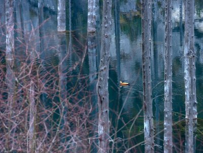 Вода в озере настолько прозрачная, сквозь неё до сих пор видны стволы деревьев, а над поверхностью торчат их вершины — словно призраки ушедшего леса. Атмосфера здесь будто из другого мира — завораживающая и немного мистическая.