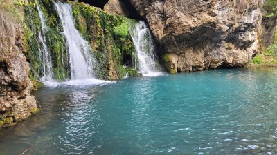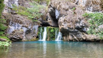 Водопад Атыш (Башкортостан). Теперь более доступный, благодаря местным предприимчивым людям. Ехать часа 2 от Уфы, до деревни Верхние Лемезы, от деревни 40 мин ехать на Шишиге (Газ66), потом идти по лесной тропинке, потом лезть вдоль скалы, держась за веревочку, потом переходить речку по стволу упавшего дерева, и вот он, спрятанный среди небольших скал, скрытый от всех нереальной красоты водопад. Кстати, он выбивается прям из пещеры, в которую можно зайти и побыть внутри, посмотреть, насколько вода голубая и сверхледяная.
