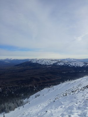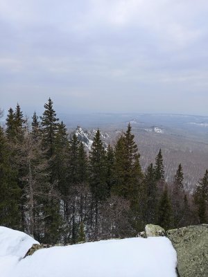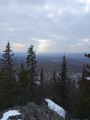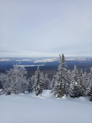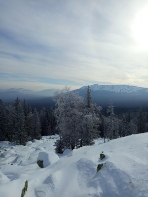 Середина марта, на улице тепло дорога лесовозная есть, что может быть не так, думали мы? но .... спустя 30 - 40 минут мы натыкаемся на поляну лесорубов и видим, что дорога закончилась. Ах-хаха ... "весело". Достаю навигатор, начинаю изучать, там ли мы, может ещё что-то где-то есть? Да нет, мы на верном пути. Ну нет, я так просто не сдамся, осматриваюсь вокруг и вижу следы от снегоходов, хоть и не свежие, но они уходят в нужном направлении. Пробуем идти, вроде бы норм, иногда проваливаясь по-колено, но вполне идти можно. Справа наконец-то открывается вид на сам хребет и весь трек будет идти вдоль хребта. Виды уже завораживающие. Снегоходка по-прежнему идёт по тропе в нужном направлении, только смущало отсутствие человеческих следов. По всему пути очень много встречалось следов всех животных, которые там обитают. В один прекрасный момент слышим сильный крик, я бы даже сказал кто-то орёт. Мы в недоумении остановились, вслушиваясь, и только спустя несколько секунд понимаем, что это лось издаёт такие звуки. Несколько раз нас пугали большие птицы, взлетающие с деревьев, от чего нарушали лесную тишину. К сожалению издалека не смог определить кто это был, но крупные. Местами лес становился гуще, что придавало какой-то загадочности и тревожности. А ещё нам по пути попался ... заяц?, быстро промчавшись через тропу. Но стоп, какой же это заяц? они мелкие, да и прыгают, а тут кто-то крупный и явно пронёсся равномерно без прыжков. Получается это была рысь!!! ещё таких обитателей я не встречал на своём пути.