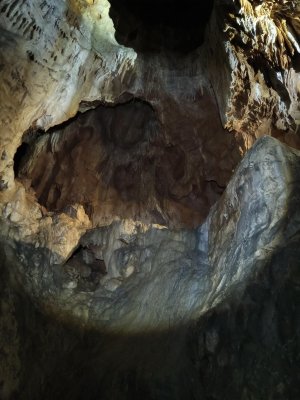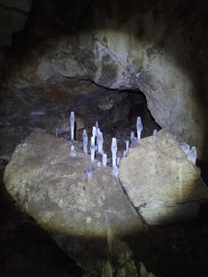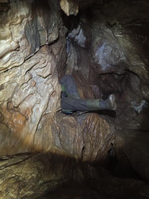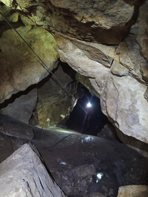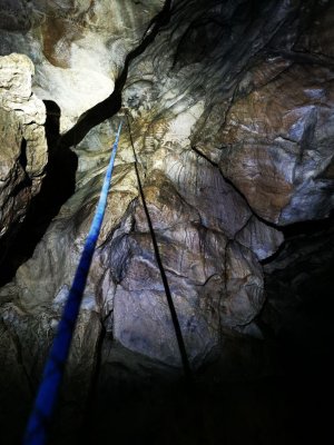 А особенно впечатлило, когда ползёшь по горизонтальному шкурнику, он резко заканчивается и твоему взору открывается глубокий колодец.... не для слабонервных. Цепляешь снарягу и спускаешься по верёвке на 15 метров вниз. Это ещё ладно, видишь что внизу, а встречаются узкие лазы с очень большим наклоном, и спуск возможен только по верёвке, но при этом не видно что дальше. Можно сравнить с крутой извилистой горкой в аквапарке.