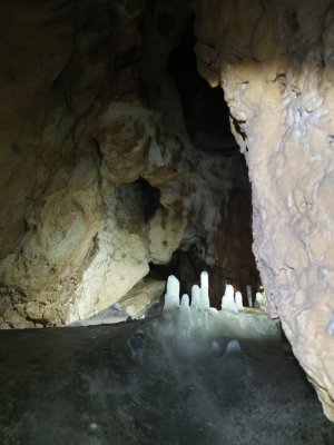 На входе всех посетителей встречают множественные сталагмиты. Такое ощущение, что они охраняют вход в пещеру. Пробравшись несколько метров в глубь сразу же и начинается ледник, уходящий в глубь пещеры, в пугающую бездну, туда, где солнечный свет никогда не бывал.