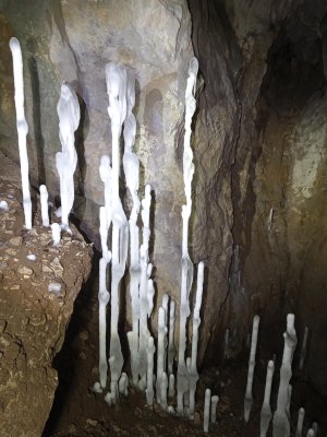На всем своем протяжении лед вплотную подходит к стенам пещеры. В средней части наледи он чистый, прозрачный, просматривается на всю толщину. У стен его толщина уменьшается до 0,2 м. Ближе ко входу лед белый, матовый, в верхней части покрыт пылью и обломками пород. С этой частью я вас сегодня и познакомлю.