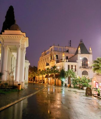 Когда дождь приходит в Сухум,город замедляется. Серые облака сгущаются над вершинами гор,растворяя их контуры в акварельной дымке. Мостовые набережной блестят,отражая огни фонарей. Воздух густ от запаха моря, субтропической листвы. Шум дождя превращает этот приморский город в тихую, умиротворенную гавань...