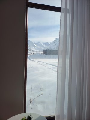 Ладно, что ни делается - к лучшему подумал я. И следующих два дня сильно сомневался в этой установке. Мело.. как в горах. Катание - ёж в тумане. Склон жёсткий и ничего вокруг не видно. Отмучился день. Дорога закрыта, метёт. Ну и ладно, есть книжка, кофе, пол бутылки чачи - прорвёмся. День провалялся за чтением и созерцанием окрестностей. Кататься не пошёл. И вот оно! Лучезарное утро третьего, совсем не запланированного дня. Это песня, это чудо - это горные лыжи!