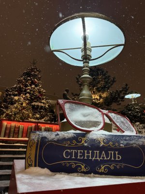 Что я увидел: — гигантские книги на лестнице — фолианты с корешками классики и редких изданий; — зелёные библиотечные лампы — латунные торшеры с тёплым светом, знакомым каждому, кто бывал в читальном зале; — хвойный лес на ступенях: ели, пихты, кедры, падуб — глубокая зелень на фоне снега и огней.