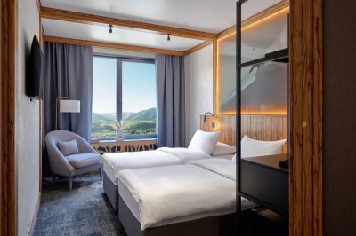 Отель «Среди Гор» 3* расположен в живописном уголке Алтая, на территории курорта Altai Palace, что делает его идеальным местом для дневных приключений и ночных развлечений. Гостям отеля доступна вся инфраструктура курорта, включающая множество уникальных локаций для незабываемого досуга: *открытые подогреваемые бассейны, *круглосуточный ресторан «Ласточки»,