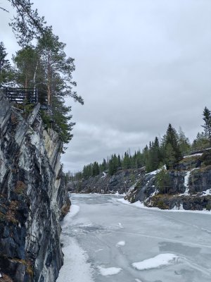 Все ещё заснеженная Рускеала и замерзшие воды озера Монферрана... Кстати, вы знали, что Огюст Монферран сам приезжал в каменоломни Рускеальского каньона и отбирали камни для строительства Исаакиевского собора в Санкт-Петербурге?